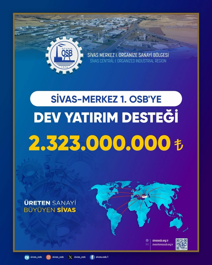 Sivas Merkez 1. Organize Sanayi Bölgesi (OSB), Sanayi ve Teknoloji Bakanlığı tarafından 2026 Yılı Altyapı Yatırım Programı’na alındı. Program kapsamında OSB’ye 2 milyar 323 milyon TL tutarında yatırım yapılması öngörülüyor.
