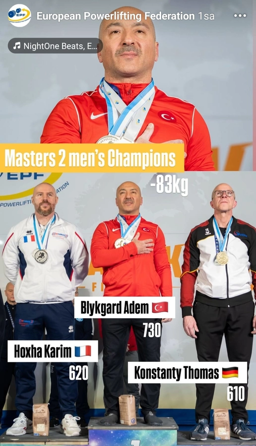 Powerlifting sporu squat, bench press ve deadlift kaldırışlarından oluşan bir halter branşıdır. Powerlifting insan vücudunun temel hareket formlarında güçlenmesini esas alan bir ağırlık kaldırma sporudur. Adem Hoca, 11 Şubat Çarşamba günü 265 kg squat, 167,5 kg bench press ve 297,5 kg deadlift kaldırışlarıyla total'de 730 kg ağırlık kaldırarak en yakın rakibine 110 kg fark atmış, dört altın madalya kazanmıştır. Squat, deadlift ve totalde daha önce kendisine ait olan rekorları yenileyerek üçüncü kez Avrupa Şampiyonu ve Dünya Rekortmeni olmayı başarmış, şanlı bayrağımızı göndere çektirerek İstiklal Marşı’mızı okutmuştur.