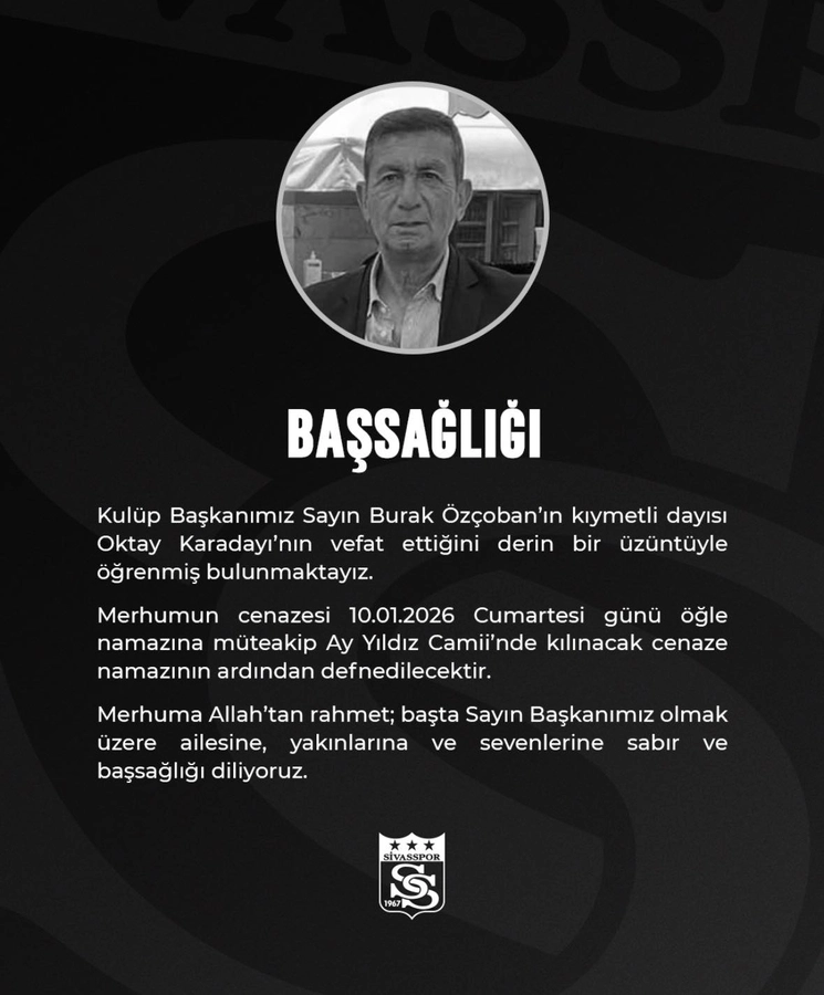Taziye mesajında; “Kulüp Başkanımız Sayın Burak Özçoban’ın kıymetli dayısı Oktay Karadayı’nın vefat ettiğini derin bir üzüntüyle öğrenmiş bulunmaktayız. Merhumun cenazesi, 10.01.2026 Cumartesi günü öğle namazına müteakip Ay Yıldız Camii’nde kılınacak cenaze namazının ardından defnedilecektir. Merhuma Allah’tan rahmet; başta Sayın Başkanımız olmak üzere ailesine, yakınlarına ve sevenlerine sabır ve başsağlığı diliyoruz” denildi.