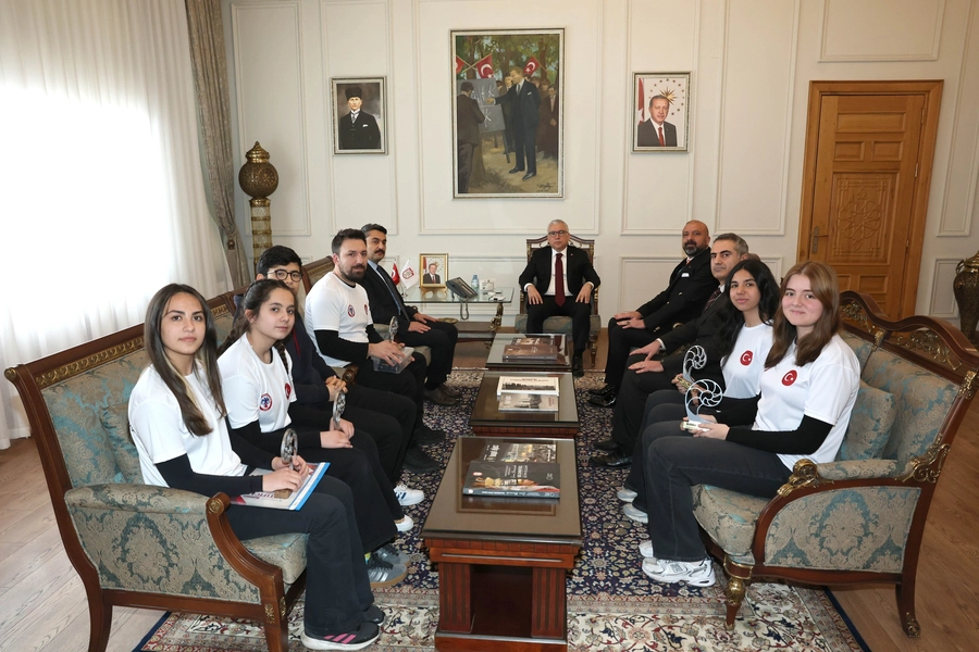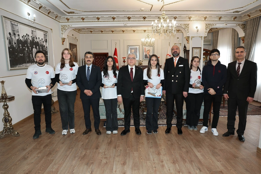Vali Yılmaz Şimşek, takım danışman öğretmeni Özgür Şeremet ile öğrenciler Asya Kangal, Eylül Mert, Fatma Betül Çolak ve İdil Havutlu’yu makamında kabul ederek başarılarından dolayı tebrik etti.